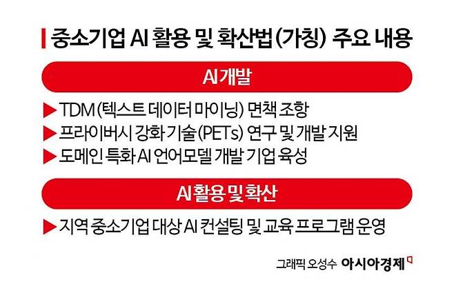 중기부 관계자는 "과기정통부가 주무 부처로 마련한 AI 기본법이 전체적인 그림을 그리기 위한 큰 틀이라면, 이번 법안은 실행을 위한 보다 구체적인 방안을 담을 것"이라며 "각종 규제로 AI 개발과 활용·확산에 어려움을 겪고 있는 많은 중소기업을 지원하는 것이 목표"라고 말했다.
