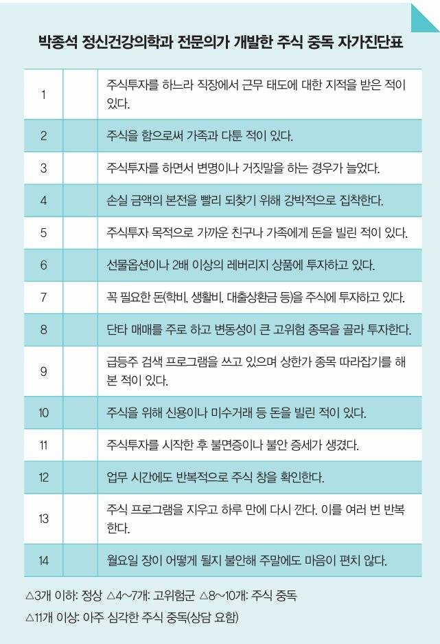 "주식으로 대인관계가 나빠지거나 직업적 기능에 문제가 생기면 주식 중독이다. 내가 주식 중독에 빠졌을 때는 매일 늦게 출근했다. 오전 9시부터 주식 차트를 봐야 하니 8시 55분 병원 주차장에 도착해서는 9시 10분까지 주식을 보다가 지각한 것이다. 근태가 나쁘다 보니 직장 동료들과의 대인관계도 안 좋아졌다."