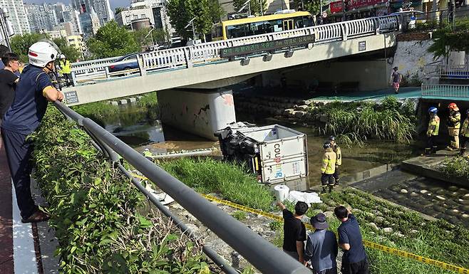 성북구서 택시와 충돌한 택배 배송 트럭 다리 아래로 추락