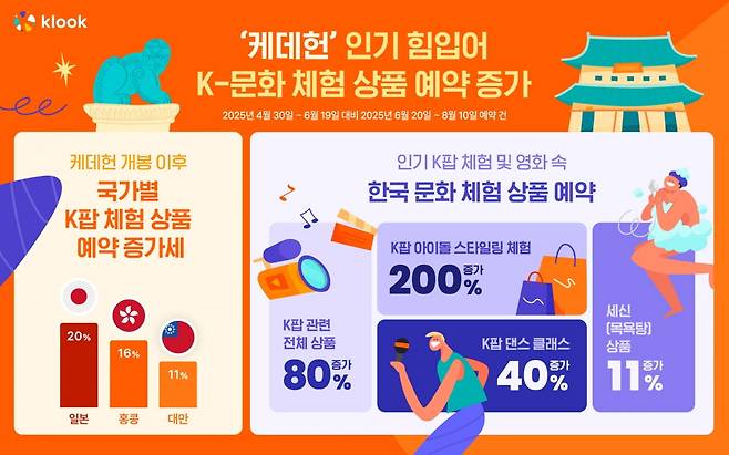 케데헌 개봉 이후 외국인 관광객들의 K팝 관련 체험 상품 예약도 동반 상승했다. 클룩에 따르면 K팝 아이돌 스타일링 체험 예약은 200%, K팝 댄스 클래스는 40% 급증했다. 일본, 홍콩, 대만 등 인접 국가에서도 K팝 관련 상품 예약이 각각 20%와 16%, 11% 증가했다. 한국을 방문한 관광객들이 콘텐츠 속 문화를 실제 여행으로 연결하는 선순환이 형성되고 있는 셈이다.