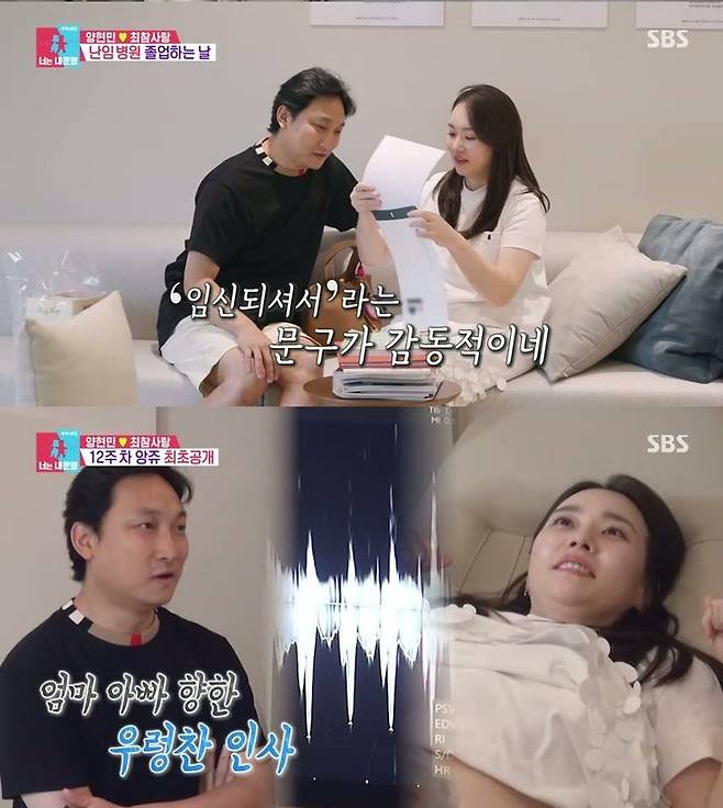 이어진 초음파 진료를 통해 12주차 앙쥬를 만난 두 사람은 연신 환한 미소를 지어 보는 이들의 마음까지 따뜻하게 했다. 심장 소리를 들은 양현민은 "경이로운 경험이다" "소리도 예쁘다"며 벅찬 마음을 드러냈다.