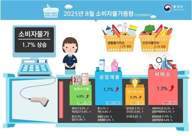 통계청이 2일 발표한 '8월 소비자물가동향'에 따르면 지난달 소비자물가지수는 전년 동월 대비 1.7% 상승(전월 대비 0.1% 하락)했다. 상승률은 7월(2.1%)보다 0.4%포인트(p) 낮아지면서 3개월 만에 다시 1%대로 내려왔다. 지난해 11월(1.5%) 이후 최소 상승 폭이다.