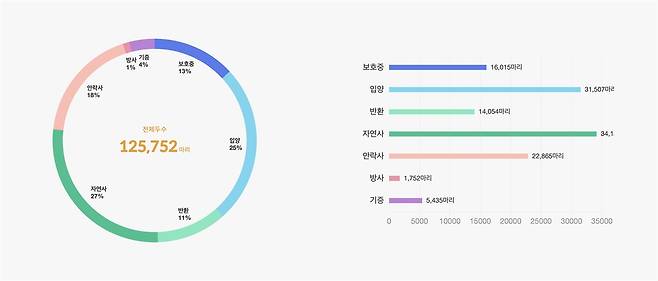 | ▲ 전국 모든 지역 유기동물 현황(2024.6 - 2025.8) 유기견 입양업체인 포인핸드에서 제공하는 유기동물 통계다. 2024년 06월 01일부터 2025년 08월 29일까지 (약 12개월) 버려진 동물의 수는 125,752마리다. 농림축산식품부의 제3차 동물복지종합계획(2025~2029)에 따르면 해마다 약 11만 마리의 동물들이 유기된다. |