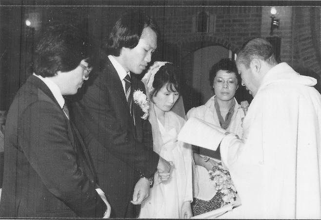| ▲ 1982년 10월 30일, 홍제동 성당에서 신랑 이범영, 신부 김설이의 혼례성사. 지금은 돌아가신, 정의구현사제단의 김승훈 신부가 혼례미사를 집전했다. |