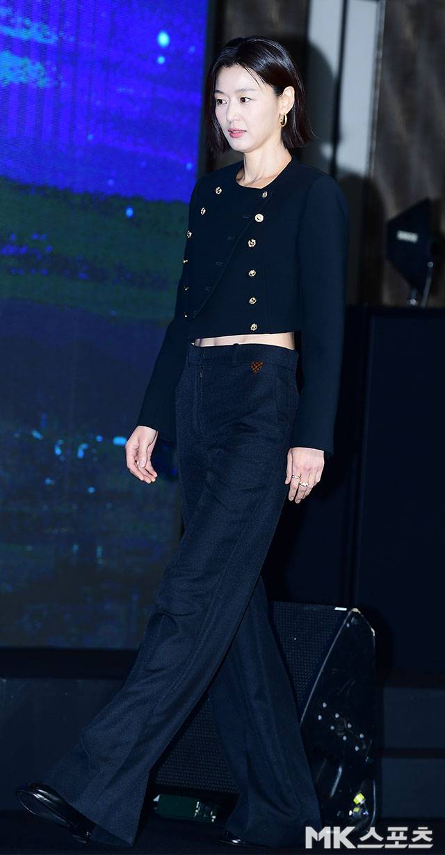 배우 전지현이 2일 오전 서울 종로구 포시즌스 호텔에서 진행된 디즈니 +오리지널 시리즈 '북극성' 제작발표회에 참석해 포즈를 취하고 있다.