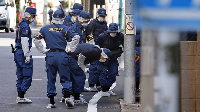 ▲ 일본 경찰이 1일 도쿄 세타가야구에서 한국인 여성이 습격당한 뒤 쓰러져 있던 장소를 조사하고 있다.