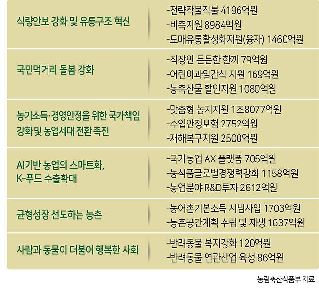 서민 장바구니 부담 완화를 위한 농축산물 할인 지원 예산은 1080억원이다. 쌀 생산 과잉을 방지하기 위해 다른 작물 재배에 인센티브를 주는 전략작물 직불 예산은 1756억원에서 내년 4196억원으로 확대한다.