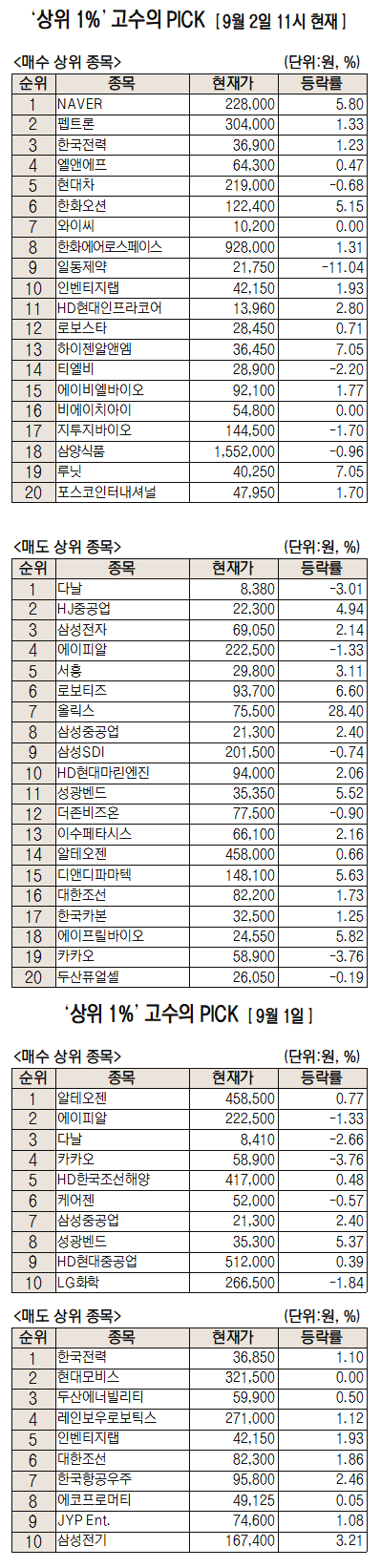 미래에셋증권은 자사 고객 중에서 지난 1개월간 수익률 상위 1% 투자자들의 매매 종목을 집계해 실시간·전일·최근 5일 기준으로 모바일트레이딩시스템(MTS) 상에서 공개하고 있다. 이 통계 데이터는 미래에셋증권의 의견과 무관한 단순 정보 안내이며 각각의 투자자 개인에게 맞는 투자 또는 수익 달성을 보장하지 않는다. 또 테마주 관련 종목은 이상 급등락 가능성이 있으므로 유의해야 한다.