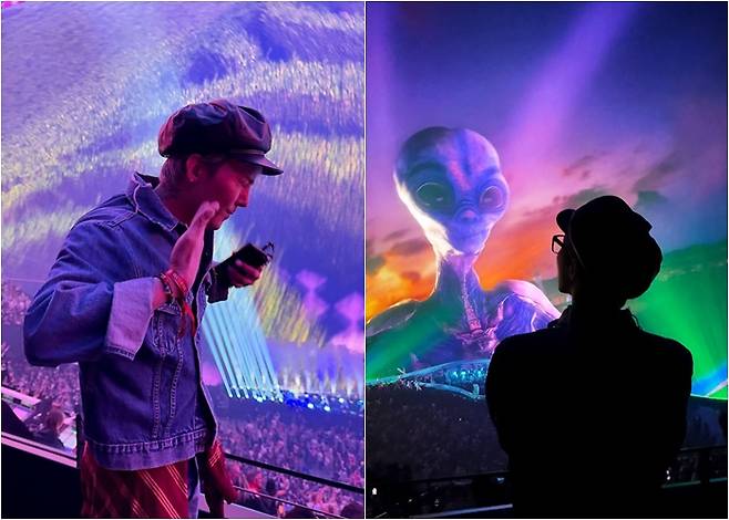 지드래곤은 최근 자신의 SNS 부계정에 사진 여러 장을 올렸다. 공개된 사진에는 지드래곤이 캐주얼한 의상을 입고 미국 라스베이거스 스피어돔에서 공연을 관람하고 있는 모습이 담겼다.