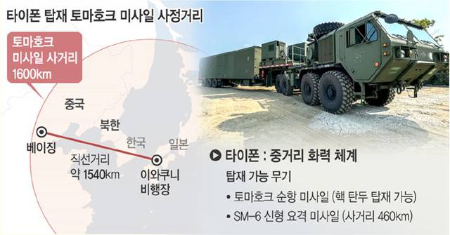 1일(현지시간) 미국 군사전문매체 USNI에 따르면 타이폰은 미 해병대와 일본 육상자위대의 합동훈련 기간 이와쿠니(岩國) 비행장과 그 인근에 배치된다. 앞서 미국은 올해 타이폰을 필리핀과 하와이에도 배치한 바 있다. 인도·태평양 지역에 군사력을 집중하는 움직임으로, 타이폰에 배치하는 미사일에 따라 중국과 북한은 사정거리에 포함된다. 토마호크 미사일의 사거리는 1600㎞ 이상인데, 이와쿠니 기지에서 중국 베이징(北京)까지 직선거리가 1540㎞로 사거리 안에 있다. 타이폰이 일본에 배치되는 것은 이번이 처음이다. 다만 실사격은 이뤄지지 않고 훈련 이후엔 철수할 것으로 알려졌다.