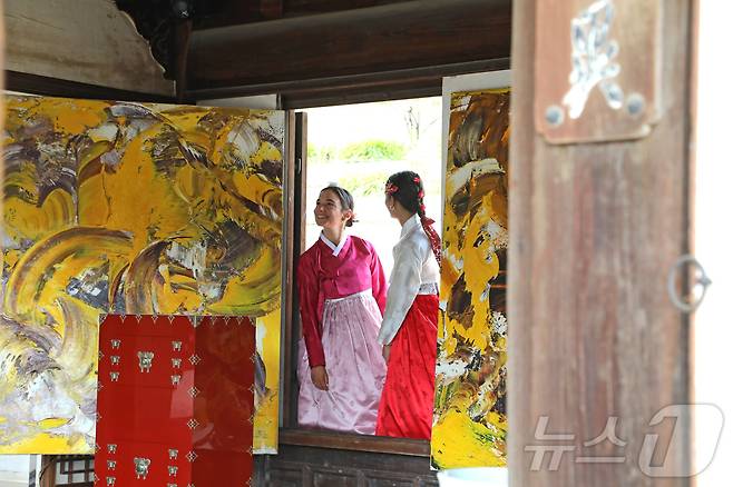 (서울=뉴스1) 권준언 기자 = 2일 서울 종로구 창덕궁 낙선재에서 열린 제3회 K-헤리티지 아트전 '낙선재遊(유) 이음의 합'을 찾은 외국인 관광객들이 한복 차림으로 작품을 감상하고 있다. 2025.9.2/뉴스1