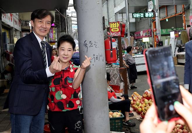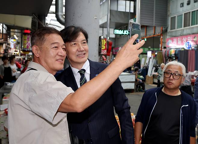 2일 오후 포항을 방문한 조국 조국혁신당 혁신정책 연구원장이 죽도시장에서 지지자들과 기념 촬영을 하고 있다. /이용선기자 photokid@kbmaeil.com