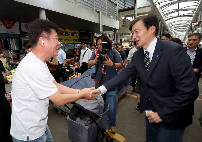 2일 오후 포항을 방문한 조국 조국혁신당 혁신정책 연구원장이 죽도시장에서 반기는 시민과 악수하고 있다. /이용선기자 photokid@kbmaeil.com