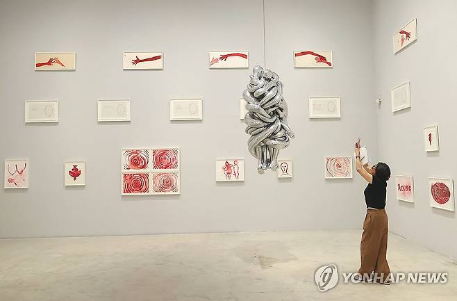 (서울=연합뉴스) 진연수 기자 = 2일 서울 종로구 국제갤러리에서 열린 현대미술 거장 루이스 부르주아 개인전 'Rocking to Infinity'에서 참석자가 작품을 관람하고 있다.