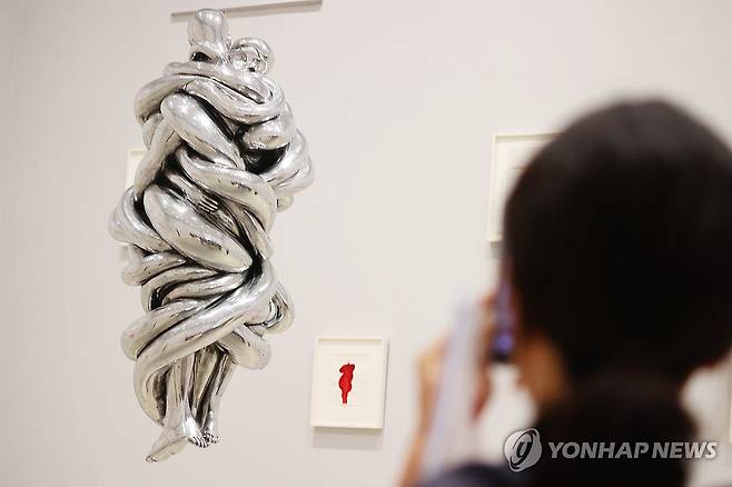 (서울=연합뉴스) 진연수 기자 = 2일 서울 종로구 국제갤러리에서 열린 현대미술 거장 루이스 부르주아 개인전 'Rocking to Infinity'에서 참석자가 '커플' 작품을 관람하고 있다.