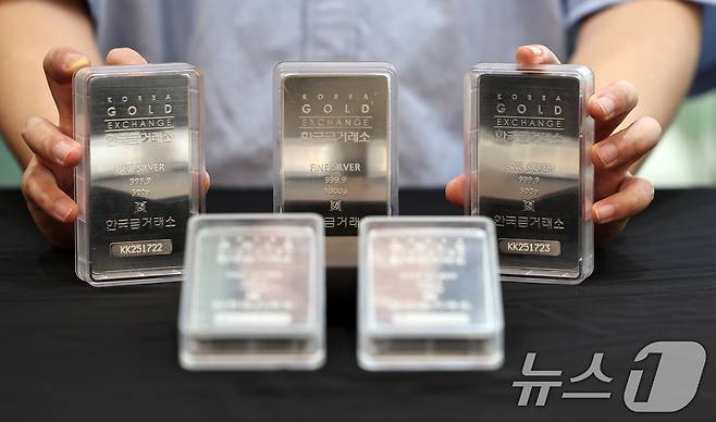 (서울=뉴스1) 구윤성 기자 = 금과 은 가격이 급등세를 보이는 2일 서울 종로구 한국금거래소에서 관계자가 실버바를 내보이고 있다.