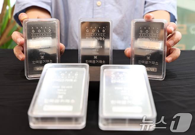 (서울=뉴스1) 구윤성 기자 = 금과 은 가격이 급등세를 보이는 2일 서울 종로구 한국금거래소에서 관계자가 실버바를 내보이고 있다.