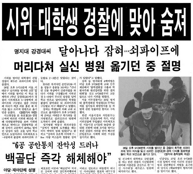 강경대 열사의 죽임은 대학가는 물론 일반 사회에도 큰 충격을 주었다.