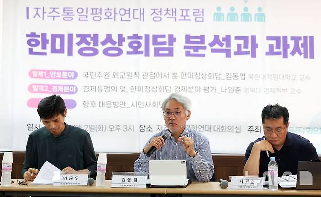 [서울=뉴시스] 김선웅 기자 = 김동엽 북한대학원대학교 교수가 2일 서울 종로구 자주통일평화연대에서 열린 한미정상회담 분석과 과제 모색 정책포럼에서 국민주권 외교원칙 관점에서 본 한미정상회담을 주제로 발제를 하고 있다. 2025.09.02. mangusta@newsis.com