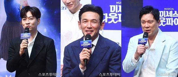 2일 오후 이화여대 삼성홀에서 뮤지컬 <미세스 다웃파이어> 제작발표회가 진행됐다. 현장에는 다니엘·아웃파이어 역의 배우 황정민·정성화·정상훈, 미란다 역의 린아, 스튜어트 역의 이지훈·김다현, 리디아 역의 김태희·설가은이 참석했다. 박혜나는 건강상의 이유로 불참했다.