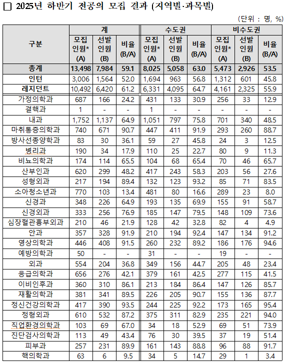 지난해 의∙정갈등 이후 병원을 떠났던 전공의들의 복귀 방침에 따라 열린 올해 하반기 모집에서 모집인원 대비 59.1%인 7984명이 선발됐다. 갈등 이전을 기준으로 보면 76% 수준을 회복했다. 그러나 소아청소년과는 모집률이 13%에 불과하는 등 필수과목은 인기과보다 복귀 움직임이 저조했다. 수도권과 비수도권의 복귀율도 10%p가량 차이 났다.