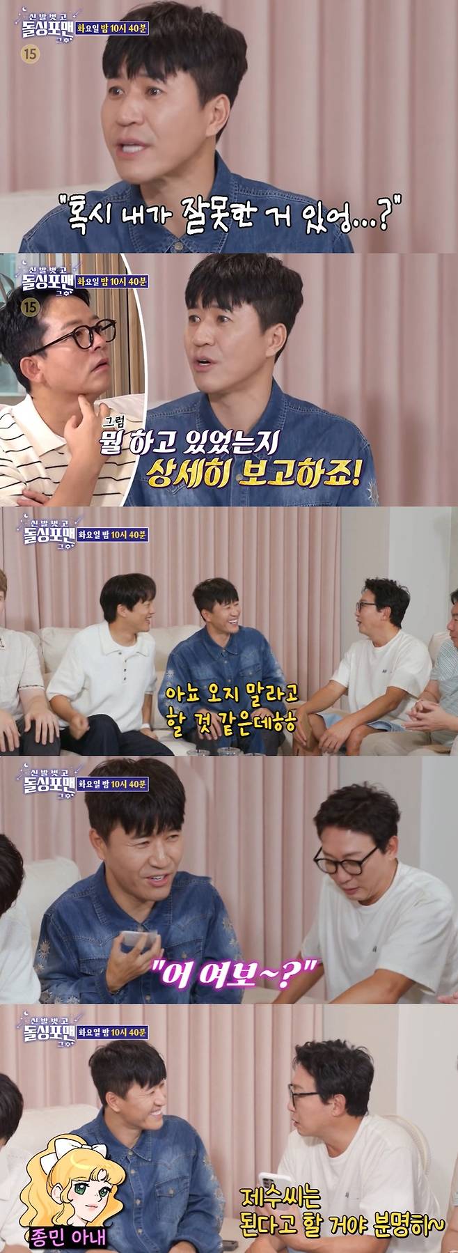 또한 이상민은 "종민이는 아내가 기분이 안 좋은 걸 느끼냐"고 물었고, 김종민은 "전 대놓고 묻는다. 내가 뭐 잘못한 거 있냐고"라고 밝혔다.