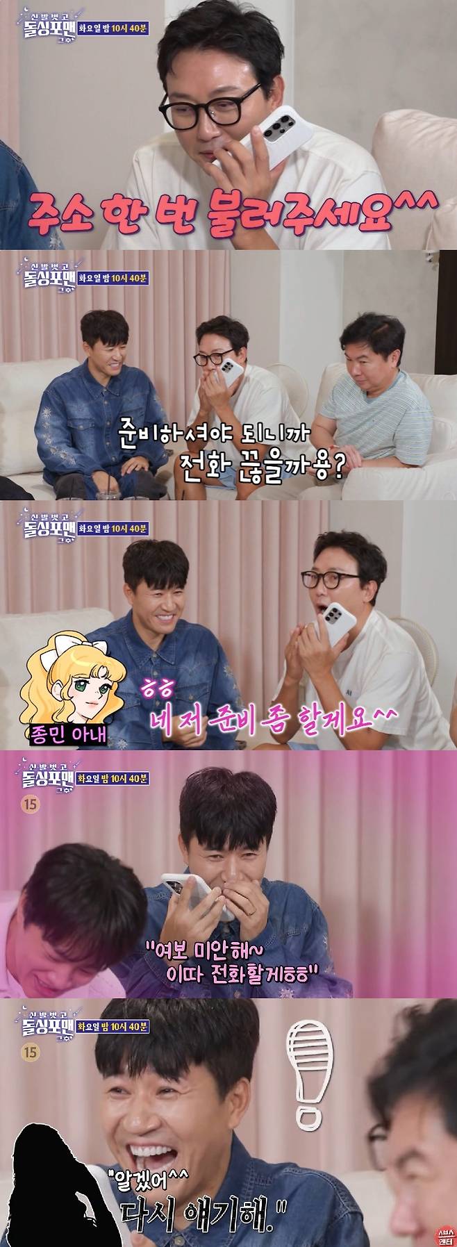 이를 들은 탁재훈은 "제수씨 합격이다"라는 이야기를 했고, 김종민은 "여보 미안해. 이따 전화할게"라며 아내에게 사과했다. 이에 아내는 "알겠어, 다시 얘기해"라는 살벌한 말을 남겨 모두를 초토화시켜 궁금증을 자아낸다.
