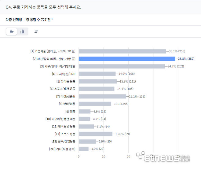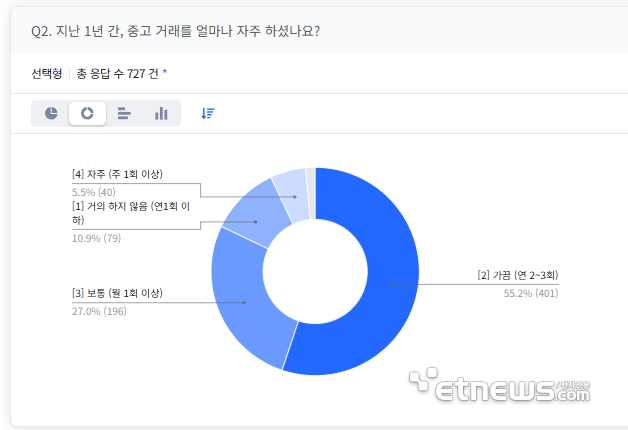 이용 빈도는 △연 2~3회 '가끔'이 55.1%로 가장 많았고 △월 1회 이상 '보통'은 27.2% △주 1회 이상 '자주'가 5.9%로 뒤를 이었다. 거래 형태는 판매 73.9%, 구매 65.4%로 모두 활발했다.