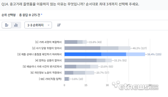 한편 중고거래 플랫폼을 이용하지 않는다고 응답했던 사람들은 그 이유로 제품 상태나 품질을 확인하기 어려워서를 1위, 사기당할 위험이 있어서를 2위로 꼽았다.