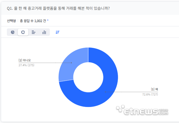 2일 전자신문이 소비자 데이터 플랫폼 오픈서베이에 의뢰해 전국 성인 남녀 1002명을 대상으로 진행한 '중고거래 플랫폼 이용 행태 조사'에 따르면 응답자의 72.9%가 최근 1년 내 중고거래 플랫폼을 이용한 경험이 있다고 답했다.