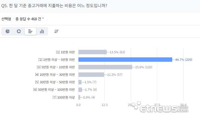 월 기준 중고거래 지출액은 '1만원~5만원 미만'이 44.7%로 가장 많았다. 반면 '30만원 이상' 고액 지출 응답은 전체의 4% 수준에 그쳐, 중고거래가 주로 소액 단위의 생활 밀착형 소비로 이뤄지고 있음을 보여줬다.