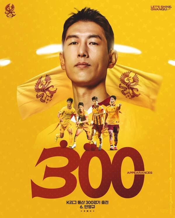 300경기를 맞이한 안영규는 "프로 선수로서 300경기를 달성하게 된 것에 감사하다. 특히 100경기, 200경기, 300경기를 모두 광주에서 기록할 수 있어 더욱 뜻깊다"며 "여기서 멈추지 않고 앞으로도 팬들에게 좋은 모습을 보여드리겠다"고 소감을 전했다.