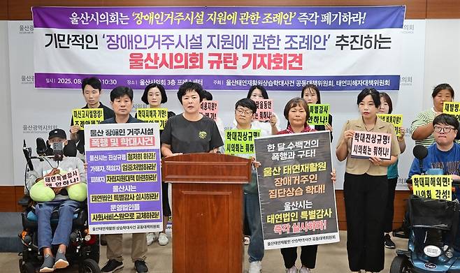 | ▲ 울산 장애인거주시설 거주인 상습학대사건 공동대책위원회가 7월 27일 오전 울산시의회 프레스센터에서 기자회견을 열고 장애인거주시설 지원 조례 페지를 요구하고 있다. |