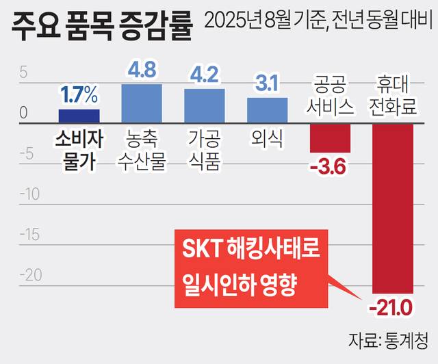 물가가 1%대로 내려간 데는 SK텔레콤의 통신요금 일시 인하 영향이 컸던 것으로 분석된다. 지난달 휴대전화료는 전년 동월보다 21.0% 급락했는데, 이는 코로나 팬데믹 때 전 국민에 통신비 2만원을 지원한 2020년 10월(-21.6%) 이후 최대 폭이다. 통계청은 통신요금이 전달과 같았다면 8월 소비자물가 상승률이 2.3%에 달했을 것으로 분석했다. 통계청 관계자는 “통신비는 규격에 포함되는 통신사별 주요 요금제와 가입자 수를 기준으로 산정한다”며 “이번에도 변동이 없어 그 수준에서 나온 것”이라고 설명했다.