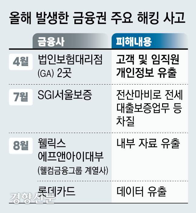 올해 금융권에서 발생한 해킹 사고는 롯데카드가 처음이 아니다. 불과 보름 전엔 웰컴금융그룹 계열사인 웰릭스에프앤아이대부에서 랜섬웨어 공격에 당해 내부 자료가 유출된 사실이 알려졌다. 지난 7월에는 랜섬웨어 공격을 받은 SGI서울보증의 전산망이 마비되는 사태가 벌어졌으며 지난 4월에도 법인보험대리점(GA) 2곳이 해킹을 당해 고객 개인정보 등이 유출됐다.