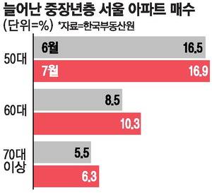 청년층보다는 상대적으로 자산이 쌓여 있는 중장년층의 7월 서울 아파트 매수 비중이 오른 것도 주목된다. 한국부동산원에 따르면 7월 서울 아파트 매수 비중은 40대가 31.8%로 가장 높았다. 규제 전인 6월에는 30대 매수 비중이 가장 높았지만 7월 들어선 2위로 밀렸다. 같은 기간 50대의 서울 아파트 매수 비중은 16.5%에서 16.9%로, 60대 매수 비중은 8.5%에서 10.3%로 오르기도 했다.