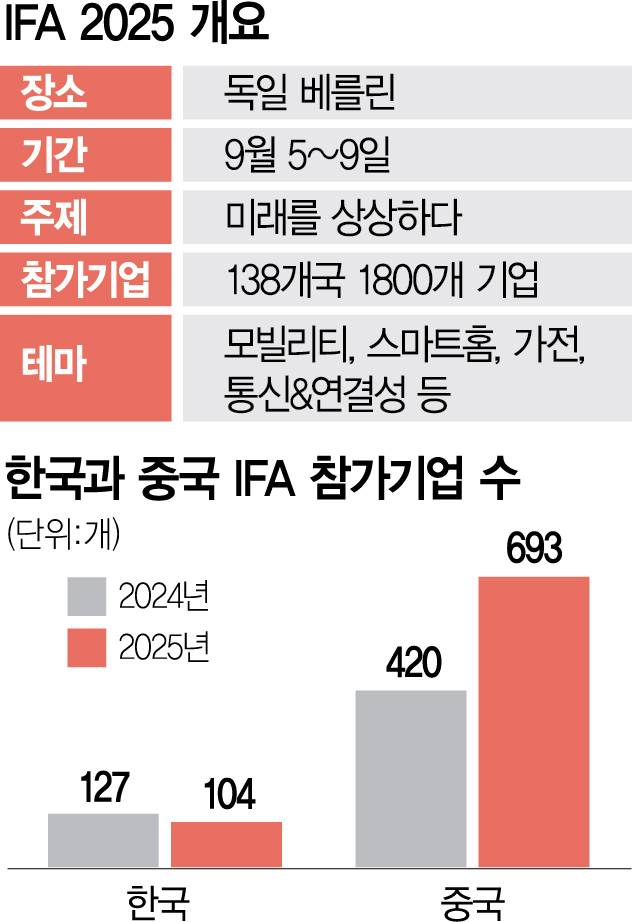 2일 업계에 따르면 이달 5일(현지 시간) 독일 베를린에서 개막하는 유럽 최대 가전 전시회 ‘IFA 2025’에 참여하는 중국 가전 기업들은 이날 기준 총 693곳에 달한다. IFA 2025에 참여하는 기업은 약 1800개로 중국 기업이 3분의 1 이상을 차지했다. 지난해에도 420개 기업이 참여했지만 올해는 65%가량 더 늘었다. 반면 한국은 지난해 127곳에서 올해 104곳으로 되레 20% 가까이 줄었다. 참가 중국 기업이 한국의 6.7배에 달하는 셈이다.