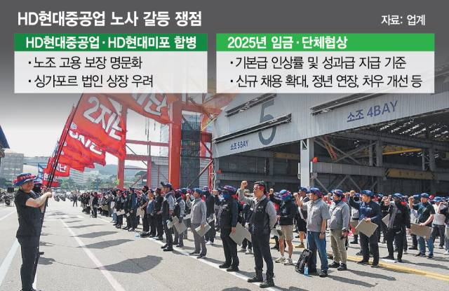 HD현대중공업 노조는 임금 및 단체 협상 타결과 HD현대중공업·HD현대미포 합병 관련 고용 보장을 요구하기 위해 파업 카드를 꺼내들었다. 노조는 지난달 27일 양 사 합병 발표 이후 고용 보장 협약서를 요구했지만 사측은 받아들이지 않았다. 노조는 합병 후 구조조정 가능성을 제기하며 사 측에 합병 세부 자료를 제공하고 고용 보장책 마련을 요구하고 있다. HD현대중공업 관계자는 “합병은 조선 경쟁력 강화를 위한 전략적 결정으로 인위적인 인원 감축 계획은 없다”며 “인력 이동 등 필요 여부는 상황을 지켜봐야 할 사안”이라고 설명했다.