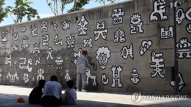 (세종=연합뉴스) 양영석 기자 = 2일 세종시 원도심에 있는 옛 신일제사 건물 벽면에 영국 출신 예술가 미스터 두들이 한글을 주제로한 작품을 그리고 있다.