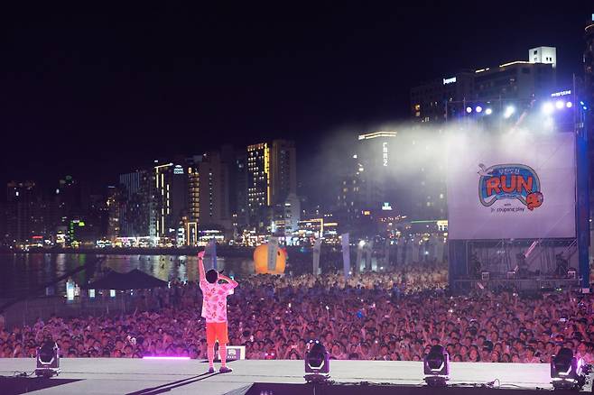 이번 행사의 공식 하와이안 셔츠 차림으로 등장한 ‘무한도전’ 멤버들이 “무한~도전!”을 외치자, 광안리 현장은 단숨에 2000년대 여름 특집 추억 속으로 빠져들었다. 곧이어 박명수, 정준하가 ‘부산’ 이행시로 티키타카를 펼치자, 팬들은 맏형들의 케미에 폭발적인 환호를 보냈고, 멤버들의 재치 있는 멘트와 팬들의 웃음이 교차하며 ‘무한도전’만의 감성과 낭만이 동시에 살아났다.