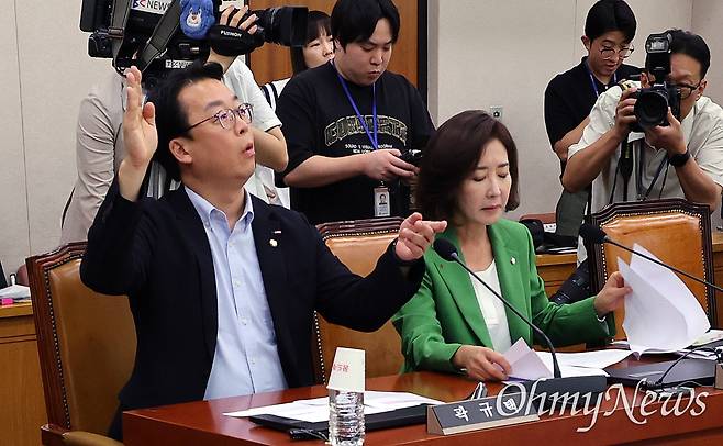 | ▲ 곽규택 "조용히 하세요! 옛날에 박지원 의원도 저한테 그랬어요." 곽규택 국민의힘 의원이 2일 서울 여의도 국회에서 열린 법제사법위원회 전체회의에서 "초선은 가만히 앉아 있어"라고 말한 나경원 국민의힘 의원에게 사과를 요구하는 박은정 조국혁신당 의원을 향해 "조용히 하세요! 옛날에 박지원 의원도 저한테 그랬어요. 저도 많이 들었어."라고 응수하고 있다. 오른쪽은 나경원 의원. |