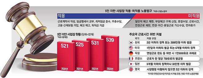 현재 최저임금과 퇴직금, 주휴수당, 고용·산재보험 등은 5인 미만 사업장에도 적용되고 있다. 하지만 일반적인 해고 제한, 휴업수당, 근로시간, 연차 유급휴가 등은 적용되지 않는다.