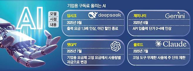 구글과 오픈AI, 딥시크 등 주요 인공지능(AI) 서비스 기업들이 기업 간 거래(B2B) 사용자를 대상으로 잇달아 가격을 올리고 있다. AI 활용이 보편화되고 업체 간 경쟁이 치열해지면서 AI 서비스 가격이 하락할 것이라는 기존 전망과는 다른 결과다.