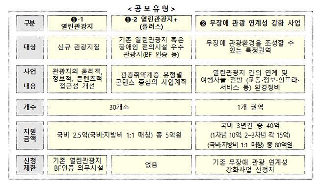 열린관광지 조성 사업은 장애유무·나이·성별에 관계없이 관광의 매력을 온전히 느낄 수 있도록 체험방법과 이동불편 등을 개선하는 사업이다. 올해는 '열린관광지 플러스' 유형이 신설돼 기존 열린관광지 또는 BF(Barrier Free) 인증을 받은 시설도 새로운 여행 콘텐츠를 도입하면 해당 지자체가 신청할 수 있다. 공모에 최종 선정된 지자체는 국비지원과 함께 대상지별 사업컨설팅, 홍보, 무장애 관광 교육 등의 지원도 받게 된다. 열린관광지와 열린관광지 플러스 선정 대상은 지자체가 신청한 관광지로, 총 30개소를 선정한다.