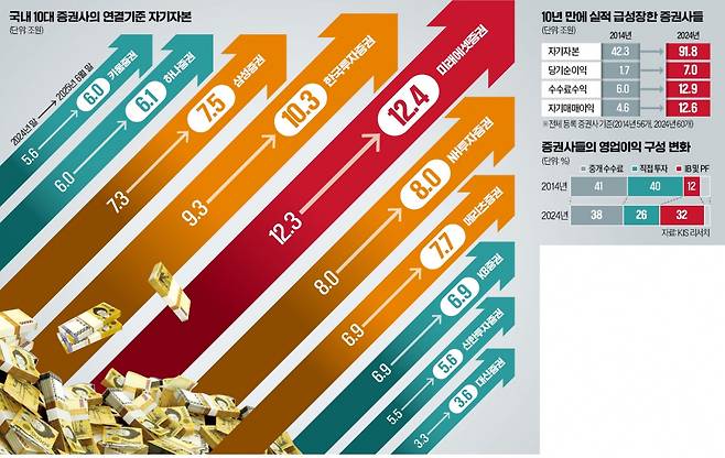 2일 한국경제신문이 국내 증권사와 은행 재무 현황을 전수 조사한 결과 최근 3년간 증권사 60곳의 자기자본 증가율은 연평균 10.6%에 달했다. 4대 은행 자기자본 증가율(5.7%)의 두 배에 이른다.