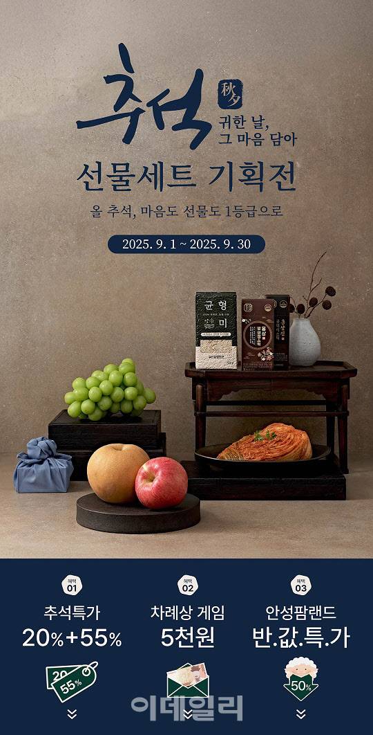 이번 행사에서는 과일, 건강기능식품 등 인기 추석 선물세트를 최대 55% 할인된 가격으로 만나볼 수 있으며, 최대 20% 추가 할인 쿠폰도 지급된다. 또한, 홈페이지에서 차례상을 완성하는 게임을 통과한 고객에게는 네이버페이 머니 5천 원을 추가 제공한다.