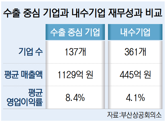 부산상공회의소 관계자는 “원청 대기업 중심의 납품 구조와 제한된 가격 결정권 등 구조적 제약으로 인해 내수기업은 수출 중심 기업 대비 수익성이 낮고 리스크에는 취약하다”며 “잠재력을 갖춘 내수기업들이 수출에 적극적으로 나설 수 있도록 행정적 지원이 필요하다”고 말했다.
