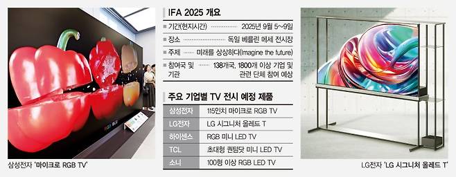 삼성전자는 이번 IFA 2025에서 세계 최초로 115인치 마이크로 RGB TV를 선보인다. 해당 제품은 액정표시장치(LCD) 기반 프리미엄 TV인 미니 발광다이오드(LED)를 잇는 차세대 TV로, LED 칩 크기를 100마이크로미터(㎛) 이하로 줄여 색 표현력과 밝기 제어를 한층 정교하게 구현한 것이 특징이다. LG전자는 세계 최초 무선·투명 TV인 'LG 시그니처 올레드 T'를 전시한다. LG전자는 지난해 북미에 이어 올해 독일, 영국 등 유럽을 포함해 20개국 이상에서 해당 제품을 출시했고 주요 프리미엄 TV 시장을 공략하고 있다.