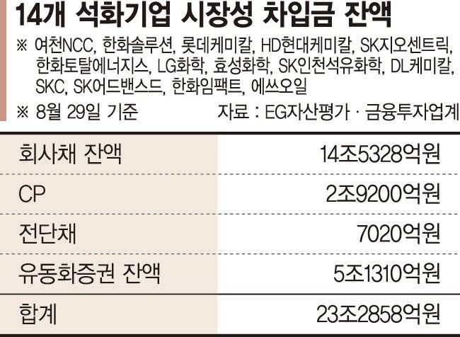 석유화학 업계 주요 14개사의 회사채, 단기채, 유동화증권 등 시장성 차입금 잔액이 23조원에 달하는 것으로 나타났다.