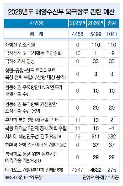 북극항로 시대를 대비해 ‘해양수도 부산’을 구현하기 위한 해수부 부산 이전 예산은 322억 원을 편성했다. 앞서 올해 해수부 부산 이전에 따른 직원 주거 안정, 임시 청사 시설 정비 등 예산으로 867억 원이 정부 예비비에서 반영된 바 있다. 또 부산항 진해신항(4622억 원)과 광양항 항만자동화(658억 원)를 비롯해 북극항로 화물별 거점 항만 조성, 대규 친환경·스마트 항만 인프라 조성 등 항만 SOC(사회간접자본)에 총 1조 6600억 원을 투입한다.